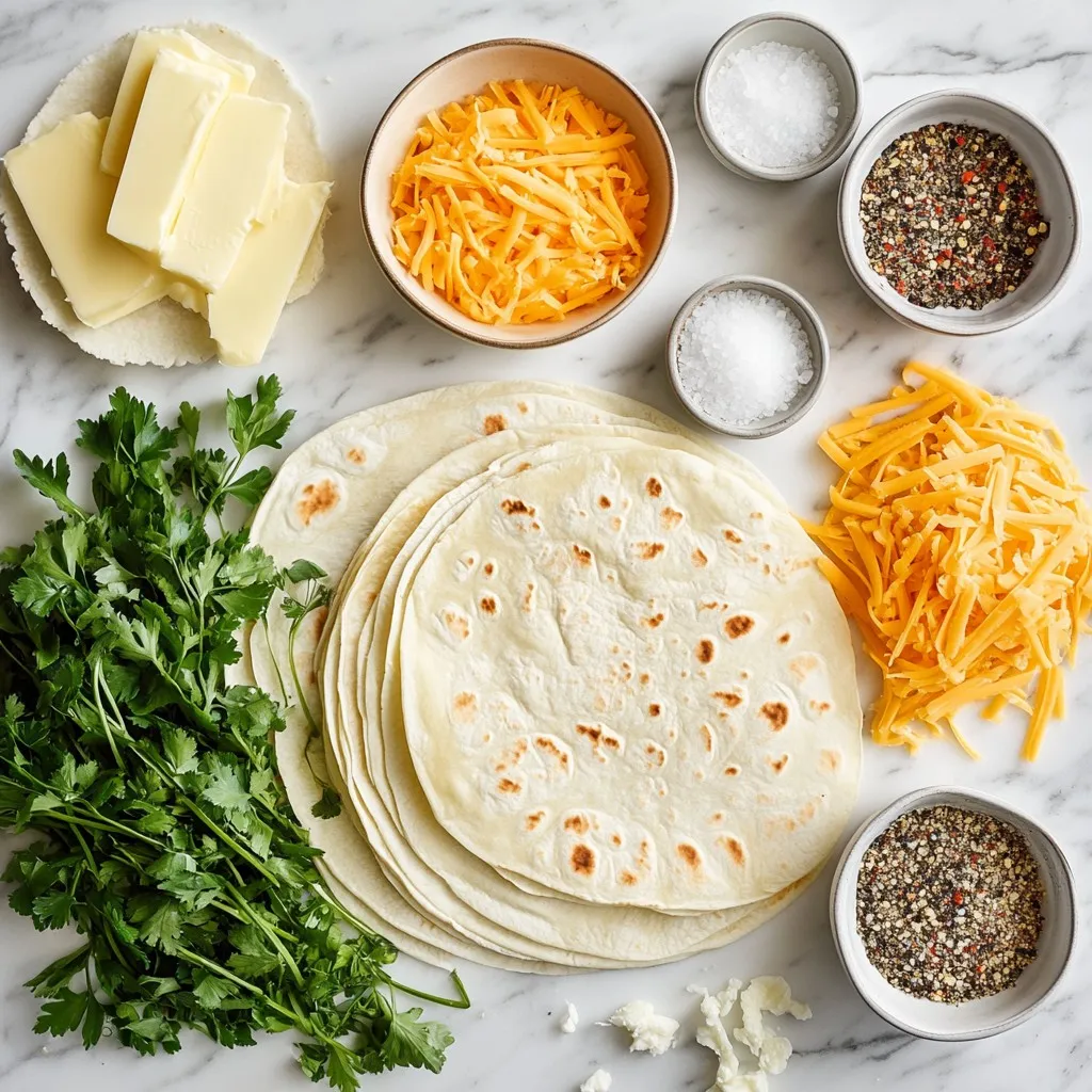 When I make Air Fryer Cheesy Tortilla Garlic Bread, I love how simple the ingredients are. First, I grab my flour tortillas. They make the perfect base. Next, I use shredded mozzarella and cheddar cheese. The blend gives a great flavor and melts beautifully.