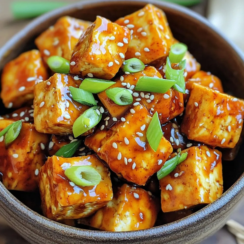 Now, your crispy tofu is ready to serve. Enjoy it hot, garnished with sliced green onions and sesame seeds!