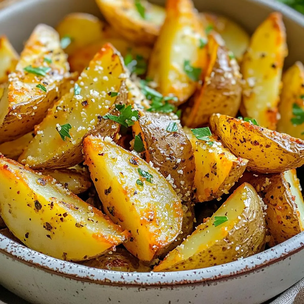 Wash 4 medium-sized russet potatoes well. Cut them into wedges, aiming for uniform sizes. In a large bowl, combine the wedges with 3 tablespoons of olive oil. Toss them so every wedge gets coated. Next, add 4 minced garlic cloves, 1 teaspoon of dried oregano, 1 teaspoon of onion powder, and 1 teaspoon of smoked paprika. Sprinkle in salt and pepper to taste. Mix everything until the wedges are fully seasoned. Finally, sprinkle ½ cup of grated Parmesan cheese over the seasoned wedges and mix gently.