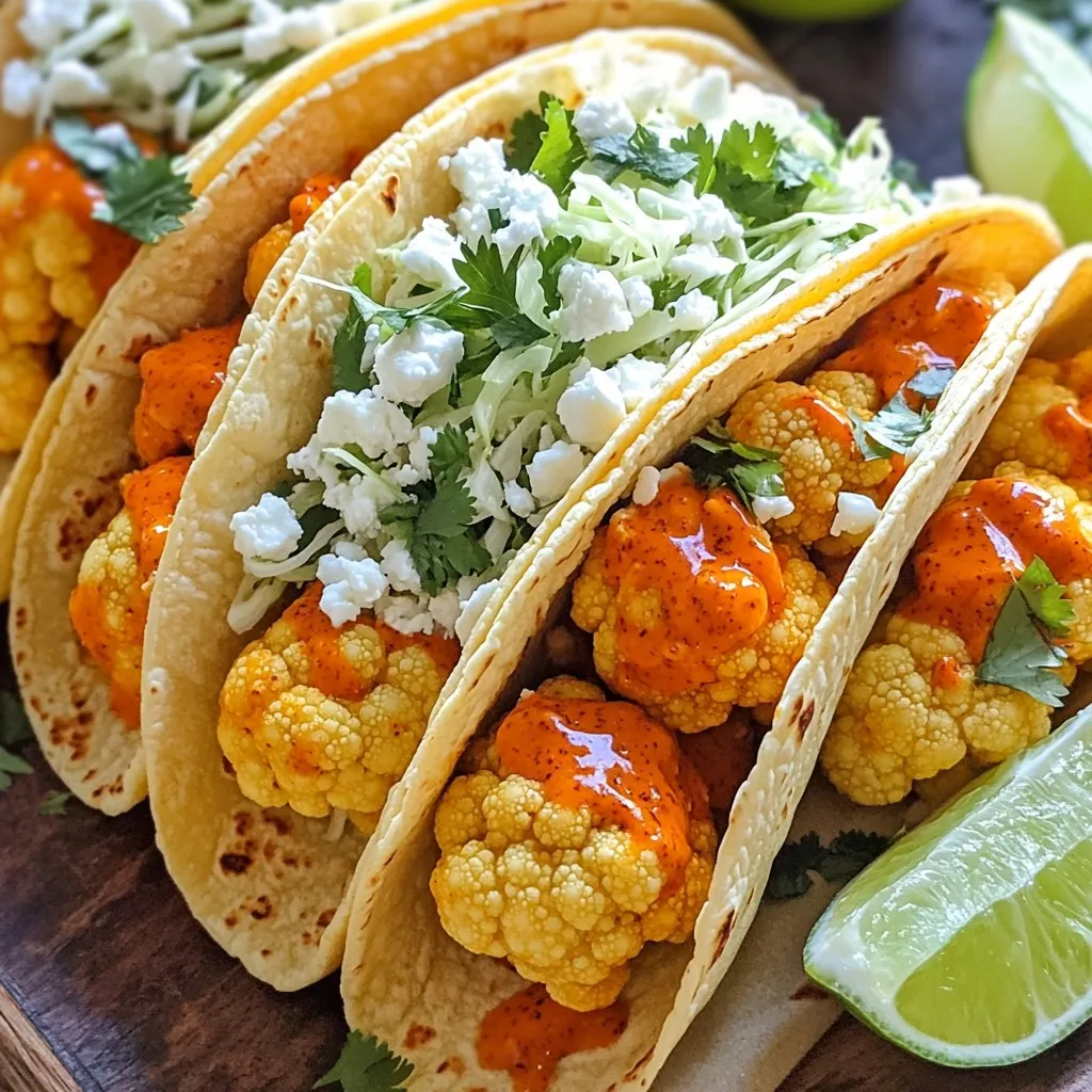 - 1 medium head of cauliflower, cut into bite-sized florets - 1 cup buffalo sauce (store-bought or homemade) - 1 teaspoon garlic powder - 1 teaspoon onion powder - 1 teaspoon smoked paprika - 1/2 teaspoon salt - 1/2 teaspoon black pepper - 8 small corn or flour tortillas - 1/2 cup shredded cabbage - 1/4 cup crumbled feta cheese (or vegan feta) - Fresh cilantro, for garnish - Lime wedges, for serving This recipe starts with fresh cauliflower florets. Choose a medium head that is firm and free of brown spots. The cauliflower gives a great base for your tacos. Next, you need buffalo sauce. You can buy it or make your own if you prefer. The sauce adds the zing that makes these tacos special. For seasoning, garlic powder, onion powder, smoked paprika, salt, and black pepper bring out the best flavor. Mix these spices well with the cauliflower. They add depth without overpowering the dish. Each spice plays a role in creating a rich, balanced taste. Toppings are key for adding texture and freshness. Use small corn or flour tortillas as your base. They hold everything together nicely. Shredded cabbage gives a nice crunch. Crumbled feta cheese, or vegan feta, adds creaminess. Finally, fresh cilantro and lime wedges brighten up the flavors. You can squeeze lime over the tacos right before you take a bite. This adds a fresh burst of flavor that is hard to beat. First, preheat your air fryer to 400°F (200°C). This step ensures even cooking for your tacos. While the air fryer heats, get your cauliflower ready. Cut one medium head of cauliflower into bite-sized florets. In a large mixing bowl, add the cauliflower florets. Drizzle one tablespoon of olive oil over them. Then, add one teaspoon each of garlic powder, onion powder, and smoked paprika. Sprinkle in half a teaspoon of salt and black pepper. Toss everything well, so every piece is coated. Next, pour one cup of buffalo sauce over the cauliflower. Toss again until all the florets are nicely covered. Now, it’s time to cook! Place the seasoned cauliflower in the air fryer basket. Make sure to arrange the pieces in a single layer. This helps them cook evenly. If you have a lot, you may need to work in batches. Air fry the cauliflower for 12 to 15 minutes. Shake the basket halfway through the cooking time. This helps to get that perfect crispy texture. Check for crispiness. The cauliflower should be tender and golden brown when done. While the cauliflower is cooking, warm your tortillas. Heat a dry skillet over medium heat. Place the tortillas in the skillet for about 20 to 30 seconds on each side. This makes them soft and easy to fold. Once the cauliflower is ready, it’s taco time! Lay a few pieces of crispy buffalo cauliflower on each tortilla. Top with shredded cabbage and crumbled feta cheese. Don’t forget the fresh cilantro for a burst of flavor! Serve your tacos with lime wedges on the side. A squeeze of lime adds a zesty touch that’s simply delightful. To get crispy cauliflower, start with a good coating. Mix the cauliflower with olive oil and spices well. Make sure every piece is covered evenly. This helps the cauliflower get that nice crunch. If you have a lot of cauliflower, cook it in batches. Overcrowding the air fryer can make it soggy. If you want to make your own buffalo sauce, combine hot sauce, melted butter, and a dash of vinegar. This mix gives you a fresh flavor. You can also add extra spices for fun. Try cayenne for heat or smoked paprika for depth. These small changes can make a big difference. Layer your tacos for the best taste. Start with crispy buffalo cauliflower as the base. Next, add shredded cabbage for crunch. Crumbled feta cheese adds creaminess. Finish with fresh cilantro for a burst of flavor. If you want a twist, use avocado or a dollop of Greek yogurt instead of feta. This can change the whole feel of the dish! {{image_2}} You can switch up the protein in these tacos easily. If you want more crunch, add chickpeas. Roasted chickpeas bring a nutty flavor and a great texture. You can also use cauliflower florets alone. They are the star of this dish. If you crave something heartier, consider adding chicken or tofu. Grilled chicken adds a nice touch of flavor. Marinate it in buffalo sauce for a spicy kick. For a plant-based option, use firm tofu. Press the tofu to remove excess water and toss it in the same sauce for a flavorful bite. If you need a gluten-free option, choose corn tortillas. They are tasty and hold up well with the fillings. You can also find gluten-free flour tortillas. Check the labels to ensure they are safe for your needs. For binding, you can use a mix of almond flour and ground flaxseed. This mix helps hold everything together without gluten. It also adds a nice nutty flavor. To make these tacos vegan, swap the feta cheese for a dairy-free version. Look for vegan feta at your local store. You can also make your own using blended cashews, lemon juice, and herbs. To make the dish fully plant-based, skip any animal products. Use the buffalo sauce made with plant-based ingredients. With these changes, you can enjoy a tasty meal that fits your diet. Store your leftover tacos in an airtight container. This keeps them fresh longer. Place a paper towel in the container to absorb moisture. You can keep them in the fridge for about 3 days. After that, the cauliflower may lose its crispiness. To reheat without losing texture, use the air fryer. Set it to 350°F (175°C) and heat for about 5 minutes. Check every minute to avoid overcooking. This helps keep the cauliflower crispy. You can also use a skillet over medium heat. Just warm the tacos for a couple of minutes on each side. You can prepare the cauliflower in advance. Just cut it into florets and store in the fridge for up to 2 days. For freezing, place the seasoned cauliflower on a baking sheet. Freeze until solid, then transfer to a bag. This way, you can use it later for quick meals. Yes, you can make these tacos spicy! To do this, try the