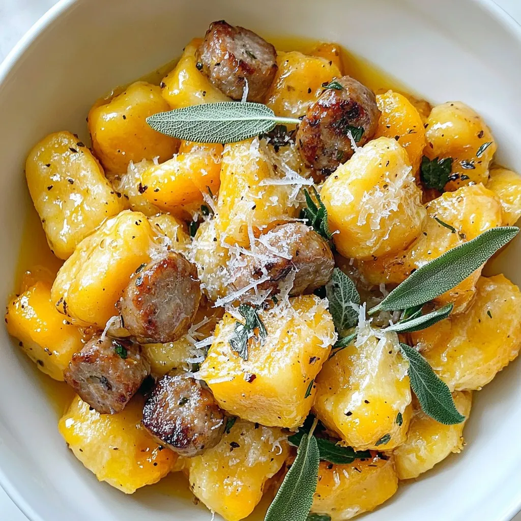 A delicious and comforting dish featuring homemade gnocchi made from roasted butternut squash, paired with savory Italian sausage.