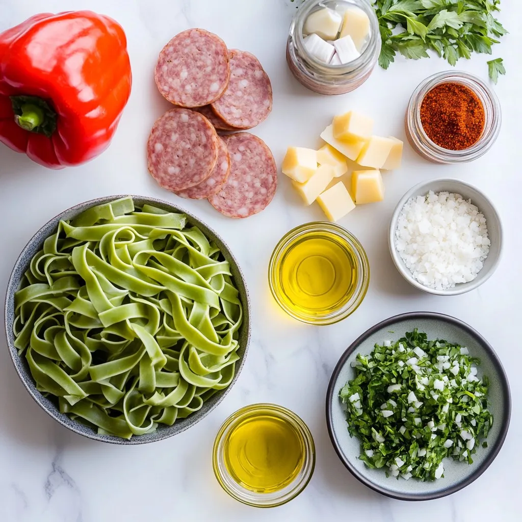 To make Cajun sausage Alfredo pasta, you need a few key ingredients. Fettuccine, a flat pasta, creates a great base. The Andouille or smoked sausage adds a rich, spicy flavor. You can choose any bell pepper, but red adds nice color. Onions and garlic add depth to the dish. Heavy cream and Parmesan cheese make the sauce creamy and rich. Cajun seasoning brings the heat, while smoked paprika adds a subtle smokiness. Don’t forget salt and pepper to taste. Lastly, fresh parsley gives the dish a beautiful finish.