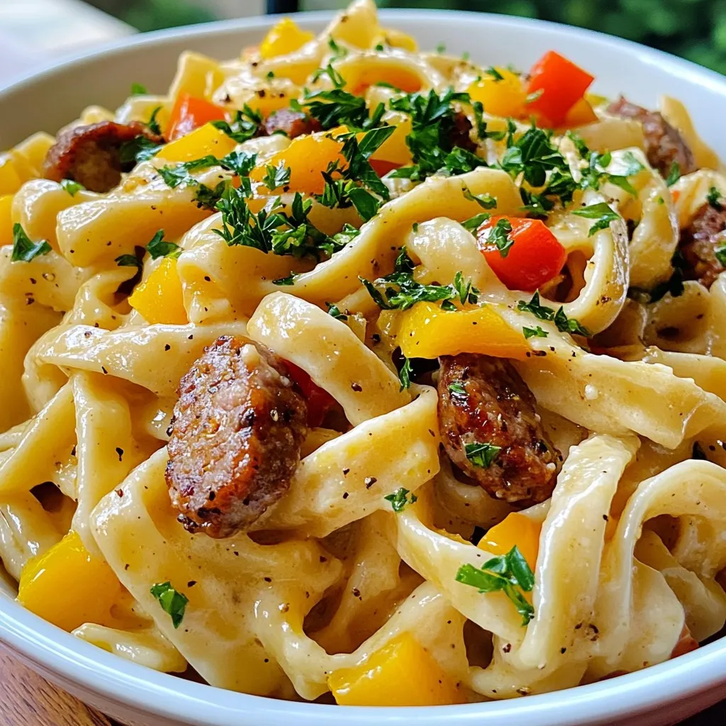 A creamy and flavorful pasta dish featuring Cajun-spiced sausage and vegetables.