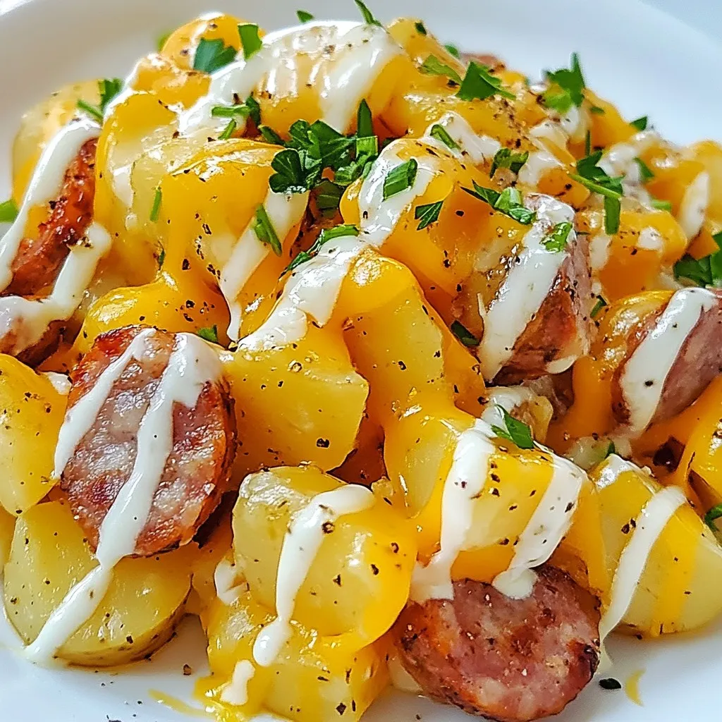 A delicious and savory dish featuring diced potatoes, smoked sausage, and melted cheddar cheese, drizzled with ranch dressing.