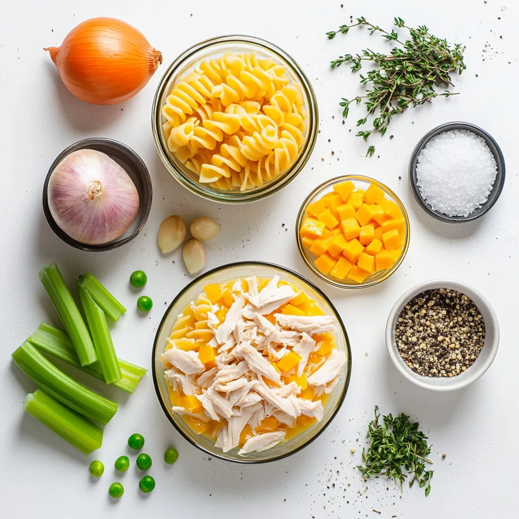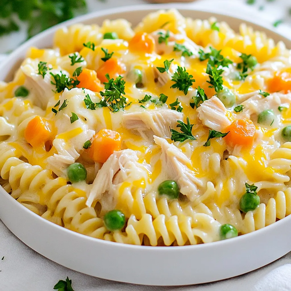 To make Chicken Pot Pie Pasta, gather these simple ingredients: - 8 oz pasta (fusilli or penne recommended) - 2 tablespoons extra virgin olive oil - 1 medium onion, diced - 2 medium carrots, diced - 2 celery stalks, diced - 2 cloves garlic, minced - 2 cups cooked chicken, shredded - 1 cup frozen peas - 3 cups chicken broth (homemade or low-sodium for best flavor) - 1 cup heavy cream - 1 teaspoon dried thyme - 1 teaspoon dried rosemary - Salt and freshly ground black pepper to taste - 1 cup shredded sharp cheddar cheese - Fresh parsley, chopped for garnish You can change this dish to suit your taste. Consider these options: - Use different pasta shapes like rotini or farfalle. - Swap cooked chicken for turkey or rotisserie chicken. - Add mushrooms for extra flavor and texture. - Toss in spinach or kale for added nutrients. - Use a blend of cheeses, like mozzarella or gouda, for a twist. This dish is not just tasty; it's also a good source of nutrients. Here’s a quick look: - Calories: Approximately 500 per serving - Protein: High due to chicken and cheese - Carbs: Comes mainly from pasta and veggies - Fats: Heavy cream and cheese add healthy fats Enjoy this hearty meal packed with flavor! {{ingredient_image_2}} To start, bring a large pot of salted water to a boil. I suggest using a good amount of salt. This adds flavor to the pasta. Once the water is boiling, add 8 ounces of fusilli or penne pasta. Cook it according to the package instructions until it is al dente. This usually takes about 8 to 10 minutes. After cooking, drain the pasta but save a small cup of pasta water. You might need it later to adjust the creaminess. Next, we’ll prepare the veggies. In the same pot, heat 2 tablespoons of extra virgin olive oil over medium heat. Once the oil is hot, add 1 medium diced onion, 2 diced carrots, and 2 diced celery stalks. Sauté these vegetables for about 5 minutes. You want them to soften and the onion to turn translucent. After that, add 2 minced cloves of garlic. Stir this mixture for about one minute. The garlic should become fragrant but not browned. Now, let’s make the sauce. Add 2 cups of shredded cooked chicken to the pot. Stir it in with the sautéed veggies. Gradually pour in 3 cups of chicken broth. Bring this mixture to a gentle simmer. Reduce the heat and mix in 1 cup of heavy cream. Now, add 1 teaspoon of dried thyme and 1 teaspoon of dried rosemary. Season with salt and freshly ground black pepper to taste. Let this simmer for 5 to 7 minutes until it thickens slightly. After thickening, fold in the cooked pasta and 1 cup of frozen peas. Stir well to combine everything. If the dish looks too thick, add a splash of the reserved pasta water. This helps reach your desired creaminess. Finally, remove the pot from heat and stir in 1 cup of shredded sharp cheddar cheese. This creates a creamy, cheesy finish. Serve hot and garnish with chopped fresh parsley for added color and freshness. To make a creamy sauce, use heavy cream. It adds richness. You can also mix in a bit of pasta water. This helps with texture and flavor. If your sauce seems too thick, add more cream or water. Stir it well until smooth and creamy. Using fresh herbs like thyme and rosemary boosts flavor. Always taste your sauce. Adjust salt and pepper based on your liking. Store any leftovers in an airtight container. Let it cool down first. Refrigerate it within two hours of cooking. Chicken Pot Pie Pasta stays fresh for about three days. For longer storage, freeze it. Make sure to use a freezer-safe container. Label it with the date. When you're ready to eat, thaw it overnight in the fridge. To make a complete meal, serve this dish with a side salad. A simple green salad pairs well. You can also offer garlic bread for a nice touch. If you want more veggies, add steamed broccoli or green beans. For drinks, a light white wine or sparkling water can enhance the meal. Enjoy it with family or friends for a cozy dinner! Pro Tips Use Fresh Herbs: Fresh thyme and rosemary can elevate the flavor profile of your dish significantly. Consider using fresh herbs instead of dried for a more vibrant taste. Cook Pasta Al Dente: Make sure to cook your pasta al dente, as it will continue to cook slightly when combined with the sauce. This will prevent it from becoming mushy. Adjust Creaminess: If the sauce is too thick after adding the pasta, use the reserved pasta water to adjust the consistency to your liking. It helps to maintain the flavor as well. Garnish for Freshness: A sprinkle of fresh parsley not only adds a pop of color but also enhances the overall flavor of the dish. Don't skip this final touch! {{image_4}} You can switch up the protein in this dish. Try turkey instead of chicken. Shredded rotisserie chicken works great too. For a seafood twist, use cooked shrimp or crab. Just make sure to add them at the right time to keep them tender. If you want a veggie version, skip the chicken. Add mushrooms for a meaty texture. Bell peppers and zucchini also work well. You can use vegetable broth instead of chicken broth. This keeps the flavor rich and satisfying without meat. Boost the flavor with spices. Add a pinch of cayenne for heat. A splash of lemon juice brightens the dish. Fresh herbs like basil or dill add a nice touch. You can also mix in some garlic powder or onion powder for depth. Experiment to find your perfect blend! To store Chicken Pot Pie Pasta, first let it cool. Use an airtight container. This keeps the pasta fresh and tasty. Try to eat it within three days. You can store it in the fridge. Avoid leaving it out for too long. When you reheat Chicken Pot Pie Pasta, do it slowly. Use a stove or microwave. If using a stove, add a little water or broth. This keeps it creamy. Heat on low to avoid burning. Stir often to warm it evenly. In the microwave, cover it to keep moisture in. Heat in short bursts, stirring in between. Freezing Chicken Pot Pie Pasta is a great option. Use a freezer-safe container. Leave 