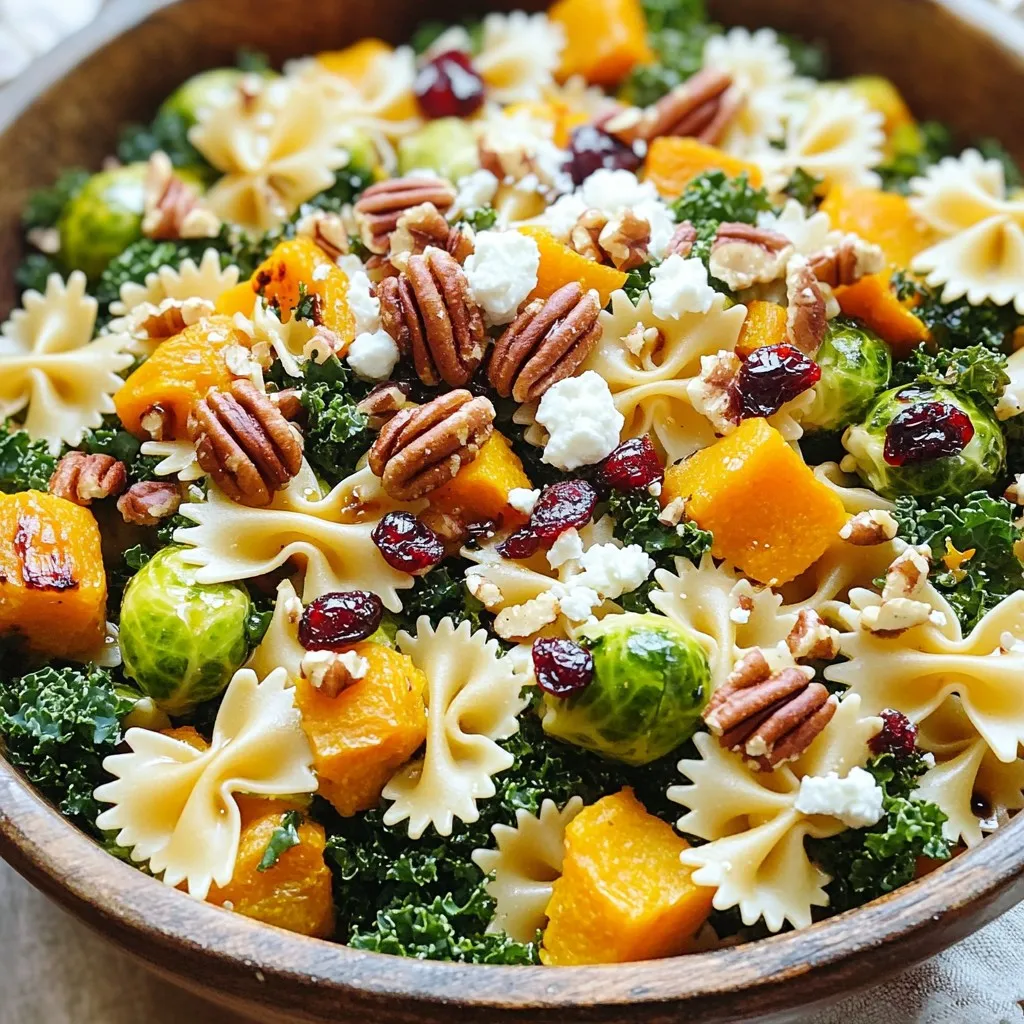 Each ingredient plays a key role in the dish. The pasta serves as a base. Butternut squash adds a sweet, nutty flavor. Brussels sprouts give a nice crunch. The kale brings in greens for health. Dried cranberries add sweetness, while pecans provide a lovely texture. Feta cheese adds saltiness that balances the flavors. The dressing ties everything together with its tangy and sweet notes.