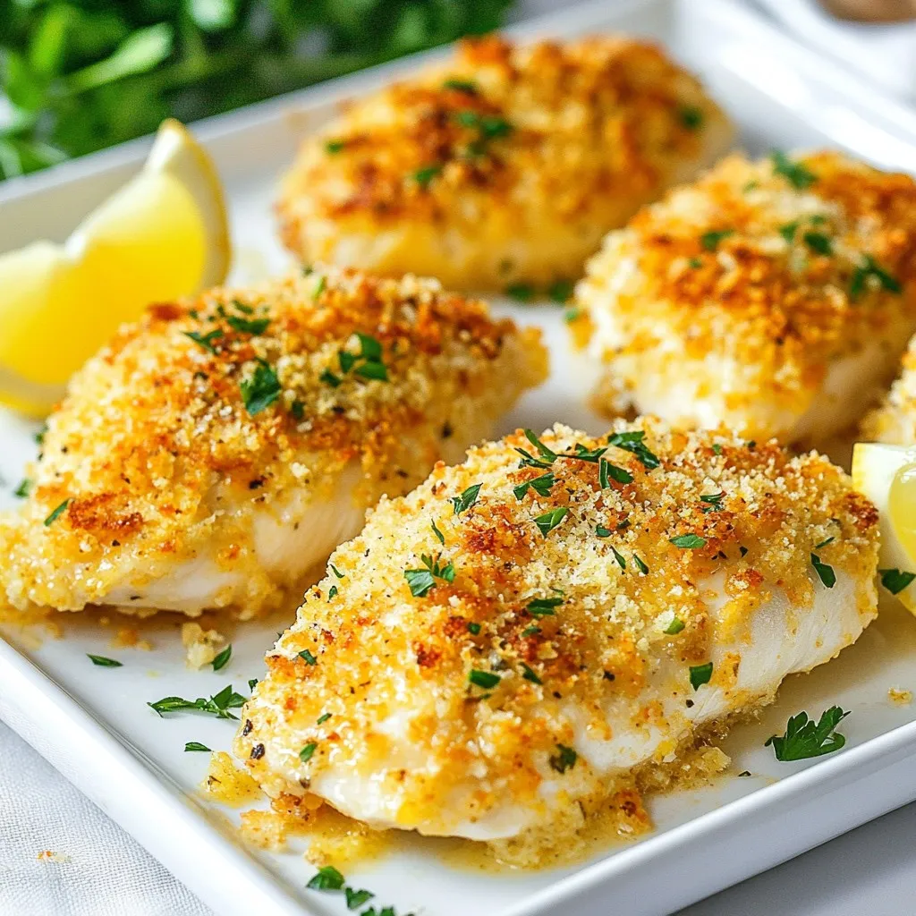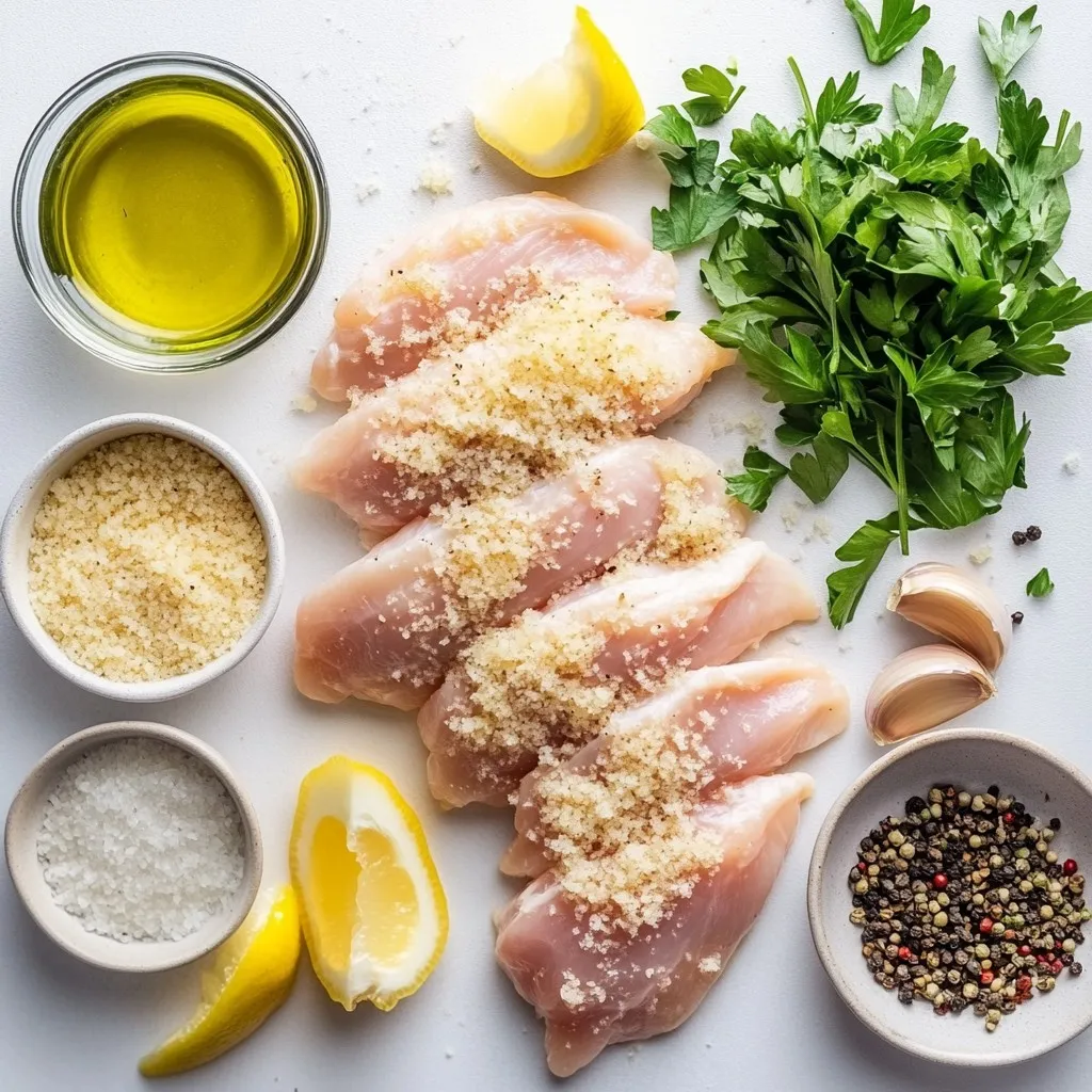 Each ingredient plays a key role in making this dish flavorful. The chicken breasts serve as the main protein. The Parmesan cheese adds a rich, salty flavor. Breadcrumbs give the chicken a nice, crispy coating. Olive oil helps everything stick and adds moisture. Garlic brings a warm, aromatic touch. Oregano and basil provide earthy notes, while salt and pepper enhance all the flavors. Fresh parsley brightens the dish, and lemon wedges add a zesty finish.