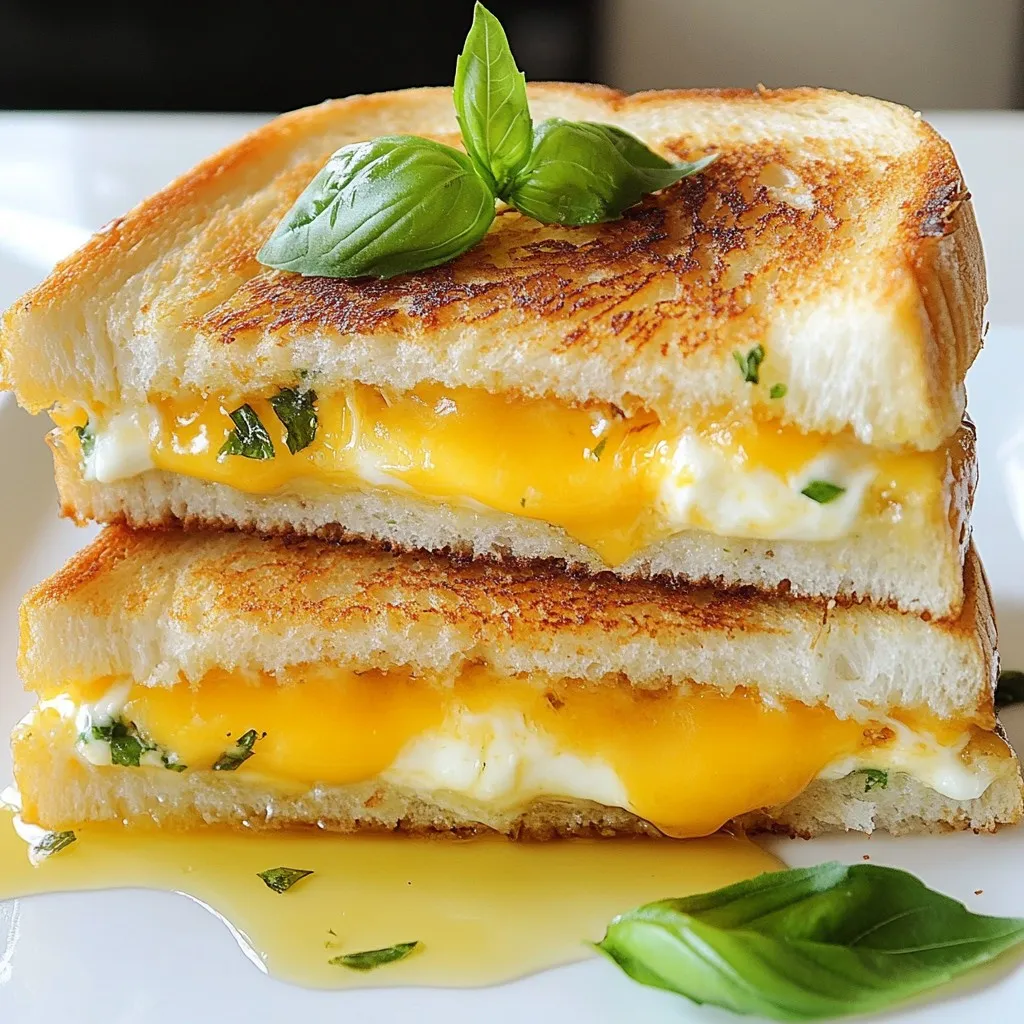 Arrange the grilled cheese sandwiches on a vibrant platter, garnishing each with a sprig of fresh basil and a drizzle of honey for a gourmet touch.