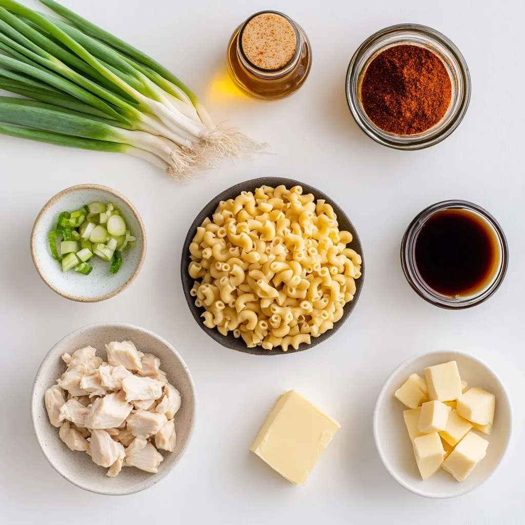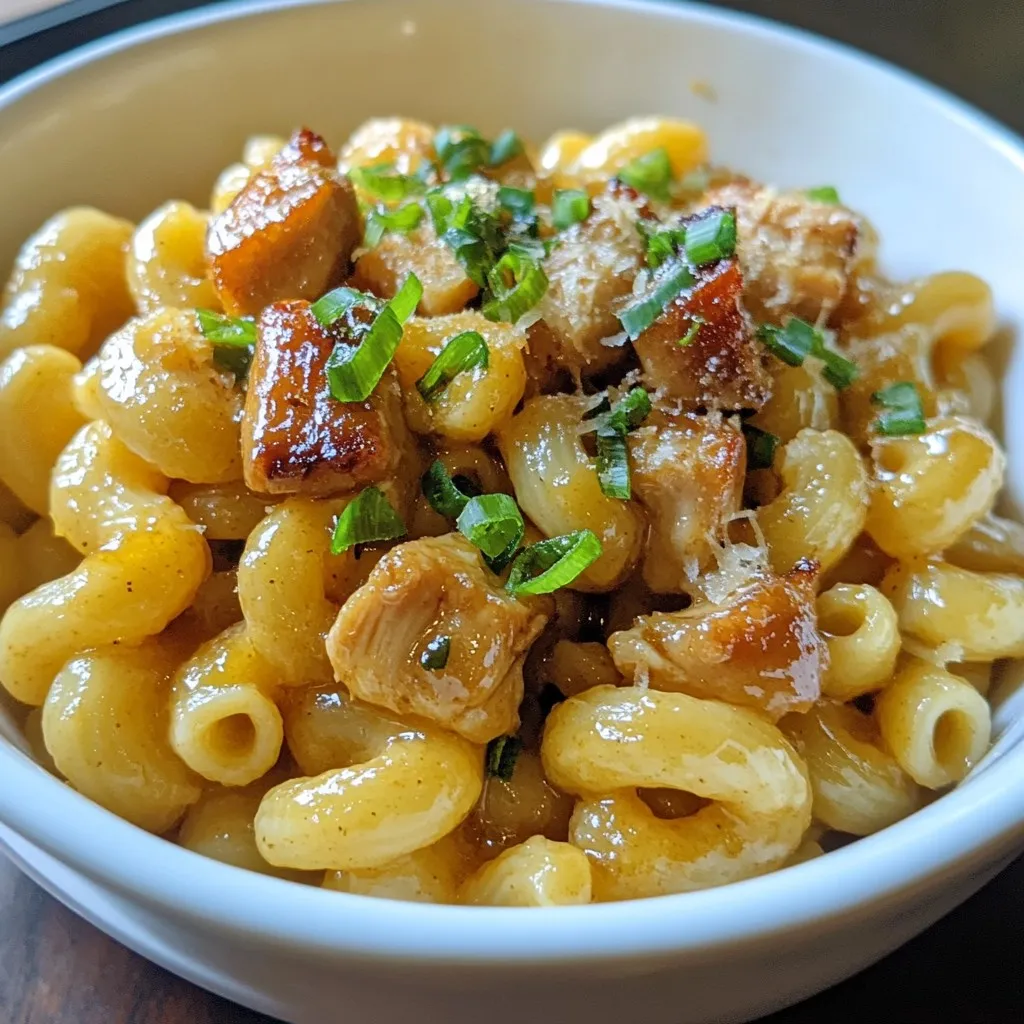 - 8 oz elbow macaroni - 1 lb chicken breast, cut into bite-sized pieces - 2 tablespoons unsalted butter, divided - 3 cloves garlic, finely minced - 1/2 cup honey (preferably local) - 1/4 cup soy sauce (use tamari for gluten-free option) - 1 tablespoon apple cider vinegar - 1 teaspoon smoked paprika - Salt and freshly ground black pepper, to taste - 2 green onions, thinly sliced (for garnish) - 1/4 cup grated Parmesan cheese (optional) This dish is simple but packed with flavor. The honey and garlic make a great sauce for the chicken. The elbow macaroni adds a fun twist. You can even use local honey for a special touch. This is a quick meal that works for busy nights. You can serve it with a salad on the side. Enjoy the yummy taste while keeping it easy to make! {{ingredient_image_2}} 1. Boil a large pot of salted water. 2. Add 8 oz of elbow macaroni. 3. Cook according to package directions until al dente. 4. Drain the pasta and set it aside. Do not rinse. 1. In a large skillet, melt 1 tablespoon of unsalted butter over medium heat. 2. Add 1 lb of chicken breast cut into bite-sized pieces. 3. Season with salt, pepper, and 1 teaspoon of smoked paprika. 4. Sauté the chicken for 6-8 minutes. Cook until golden brown and fully done. 1. Remove the cooked chicken from the skillet and place it on a plate. 2. In the same skillet, add the remaining tablespoon of butter and 3 minced garlic cloves. 3. Sauté the garlic for 1-2 minutes until it smells great. 4. Pour in 1/2 cup of honey, 1/4 cup of soy sauce, and 1 tablespoon of apple cider vinegar. 5. Stir to mix all the ingredients and let it simmer for 2-3 minutes. This helps the sauce thicken. 1. Put the chicken back into the skillet. Toss it in the honey garlic sauce. 2. Add the cooked macaroni to the skillet and mix everything well. 3. Cook for an additional 2 minutes to let the flavors blend perfectly. 4. Remove from heat. Garnish with sliced green onions and sprinkle with Parmesan cheese if you like. Serve hot and enjoy! To achieve perfectly cooked chicken, start with bite-sized pieces. This helps cook the chicken evenly. Season the pieces well with salt, pepper, and smoked paprika. Sauté them in butter over medium heat. Cook until they turn golden brown, about 6-8 minutes. Keep stirring to ensure they don't stick. For cooking macaroni to al dente, boil a large pot of salted water. Add the elbow macaroni and follow the package directions. Check about a minute before the time is up. You want the pasta tender but still firm to the bite. Drain and set aside without rinsing. This keeps the starch that helps the sauce stick. Using homemade or local honey gives the best flavor. Local honey adds a taste of your area and can be healthier. If you can, visit a local market for fresh honey. You can also add spice variations to your dish. Red pepper flakes give a nice kick. Add them when you mix the chicken with the sauce. You can adjust the amount based on your heat preference. Pair your Honey Garlic Butter Chicken Mac with side dishes or salads. A green salad with a light dressing works well. You can also serve it with steamed veggies for added color and nutrition. For creative presentation, serve the mac in bowls and top with green onions. A sprinkle of Parmesan cheese adds a nice touch. You can also use a drizzle of honey on top for a sweet finish. Enjoy your meal! Pro Tips Use Local Honey: Local honey can enhance the flavor of your dish and supports local beekeepers. It’s often richer in taste than mass-produced honey. Perfectly Cooked Pasta: To avoid mushy pasta, always cook your elbow macaroni until al dente. This ensures it retains a slight bite and holds up well in the sauce. Adjust Sweetness: Feel free to adjust the amount of honey based on your taste preference. If you like it sweeter, add a bit more, or reduce it for a more savory flavor. Add Vegetables: For a more balanced meal, consider adding some sautéed vegetables like bell peppers or spinach into the mix for added nutrition and color. {{image_4}} You can switch up your pasta by using gluten-free options like rice or chickpea pasta. This keeps the dish tasty for those with gluten issues. For chicken, try using tofu or shrimp instead. Tofu absorbs flavors well, and shrimp cooks quickly. Both options can give you a fun twist. If you're dairy-free, just skip the cheese. The dish stays delicious without it. For a low-sugar option, consider using agave syrup or monk fruit sweetener instead of honey. Both will still give you that sweet taste without the sugar rush. Changing the sauce can change the whole dish. Swap honey garlic for teriyaki or barbecue sauce for a new flavor. You can also add veggies like broccoli or bell peppers. This not only adds nutrition but also makes the dish more colorful and fun. To keep your Honey Garlic Butter Chicken Mac fresh, follow these steps: - Allow the dish to cool down to room temperature. - Place leftovers in airtight containers. - Store in the fridge for up to three days. This way, you can enjoy your meal later without losing flavor. You can reheat your dish using two methods: - Stovetop: Place the mac in a skillet. Add a splash of water or broth. Heat on low until warm. Stir often to keep it moist. - Microwave: Put the mac in a microwave-safe bowl. Cover it loosely. Heat for 1-2 minutes, stirring halfway through. Both methods keep the texture and taste great! If you want to save some for later, freezing works well: - Portion the mac into single servings. Use airtight containers or freezer bags. - Label them with the date. Freeze for up to three months. When you're ready to eat, defrost in the fridge overnight. Reheat as mentioned above for best results. Enjoy your meal anytime! If you need a honey substitute, try maple syrup or agave nectar. Both add sweetness. You can also use brown sugar mixed with water for a similar taste. Each option gives a unique twist, so pick what you like best! You can store Honey Garlic Butter Chicken Mac for up to four day