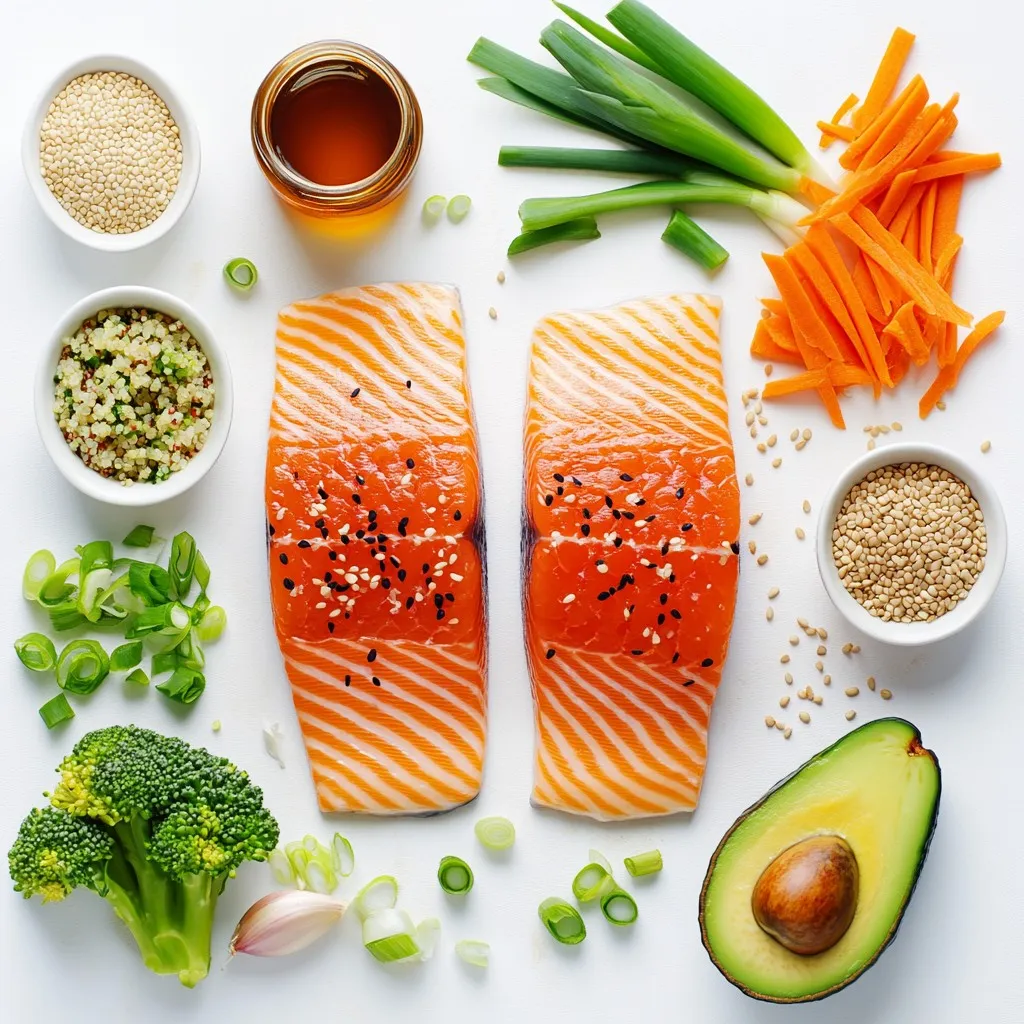 The salmon is the star here. It brings flavor and healthy fats to the dish. The honey and soy sauce create a sweet and salty marinade. Garlic and ginger add depth. These ingredients combine to make the salmon delicious.