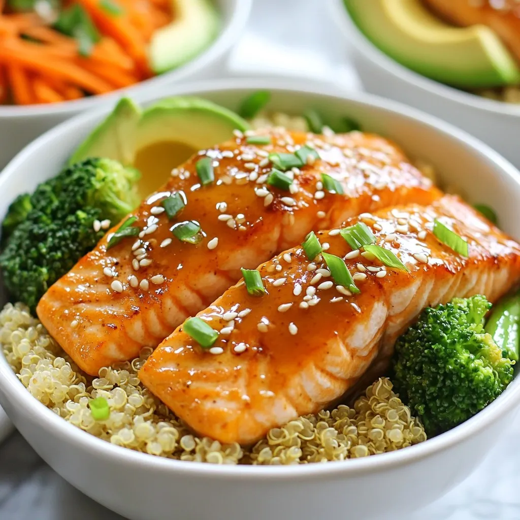 A delicious and healthy bowl featuring marinated salmon, quinoa, and fresh vegetables.