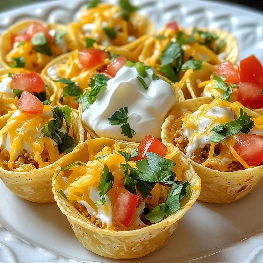 Serve the warm taco cups garnished with a generous amount of freshly shredded lettuce, diced tomatoes, a dollop of sour cream, and a sprinkle of chopped cilantro for a pop of color and flavor.