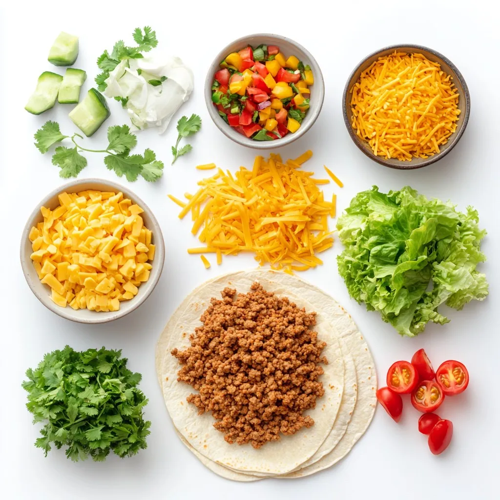 To create these mini baked chicken tacos, you need a mix of simple ingredients. Ground chicken provides the base. Olive oil, onion, and garlic add flavor. Cumin and chili powder bring warmth and spice. Corn tortillas form the taco shells, while cheese, lettuce, tomatoes, and sour cream add freshness and creaminess.