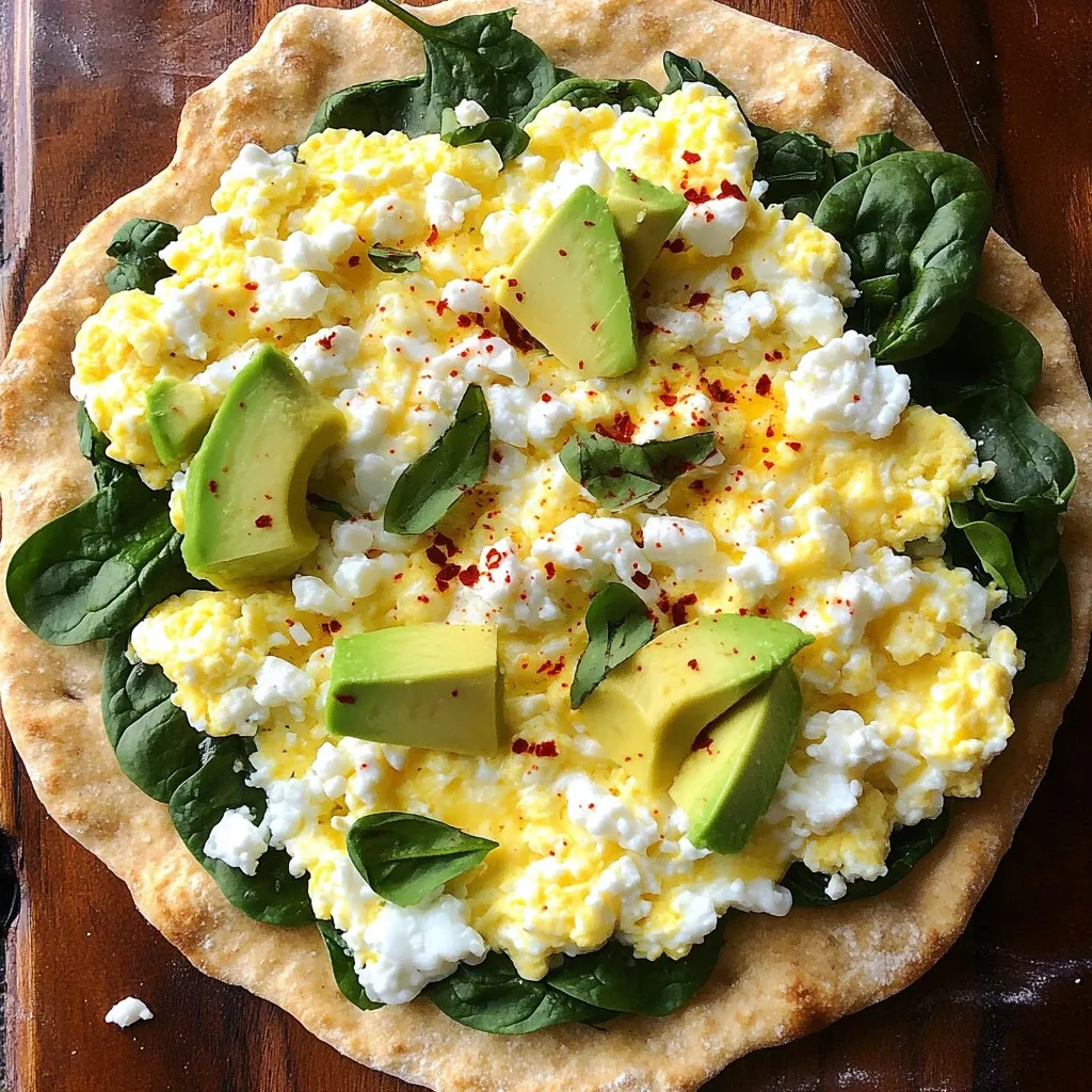 The whole wheat flatbread serves as a sturdy base. It adds fiber and keeps the meal filling. Scrambled eggs provide protein, making this a great start to your day. Cottage cheese adds creaminess and extra protein, while baby spinach gives a boost of vitamins.