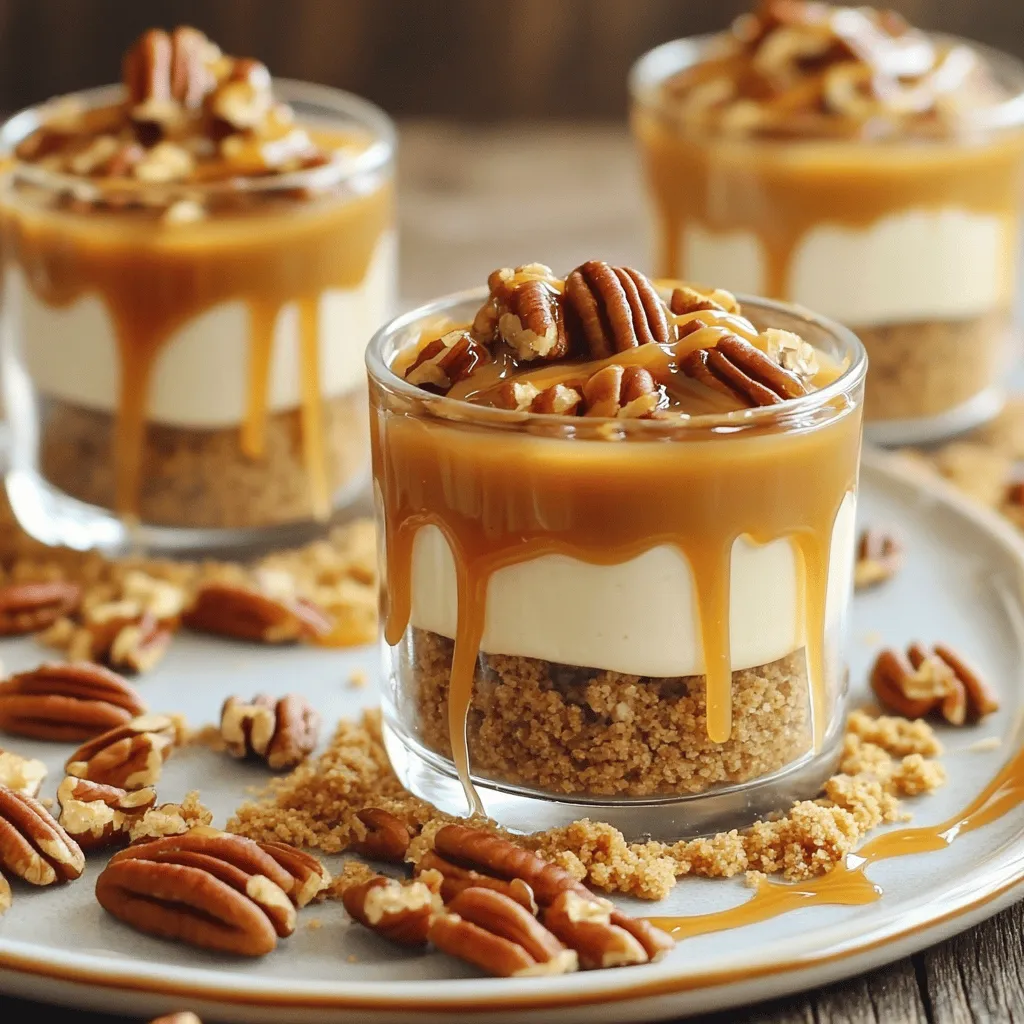 Serve these cheesecake cups on a lovely platter. Choose a bright, colorful one to make the dessert pop. Drizzle extra caramel sauce on top for flair. You can create a swirl to make it look fancy. Sprinkle chopped pecans over the top. This adds texture and makes it appealing. Place some extra pecans around the cups for a nice touch.