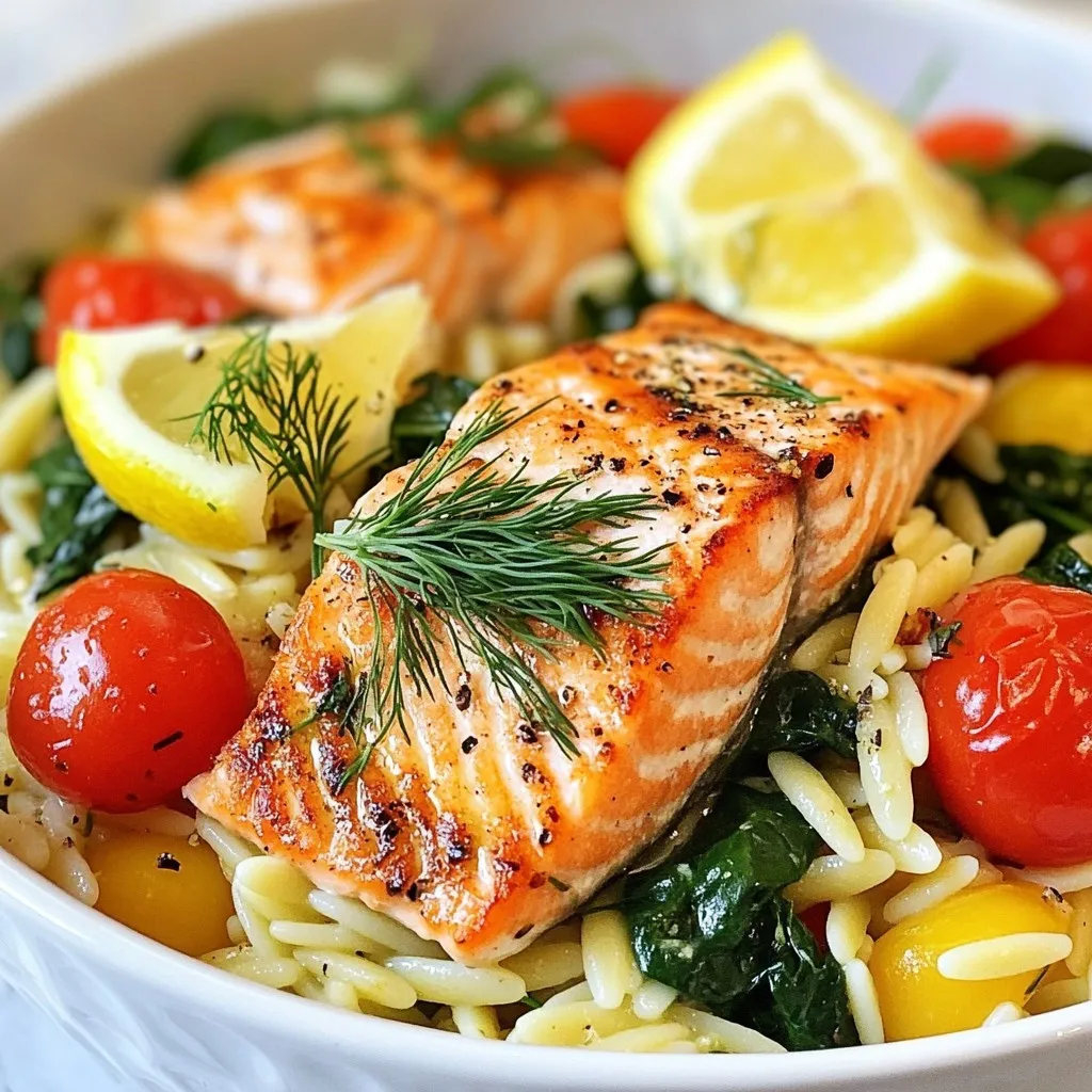 The main ingredients create a bright and zesty dish. Salmon is the star here, providing rich flavor and healthy fats. Orzo pasta adds a fun texture that pairs well with the fish. The cherry tomatoes bring sweetness, while spinach adds a pop of color and nutrients.