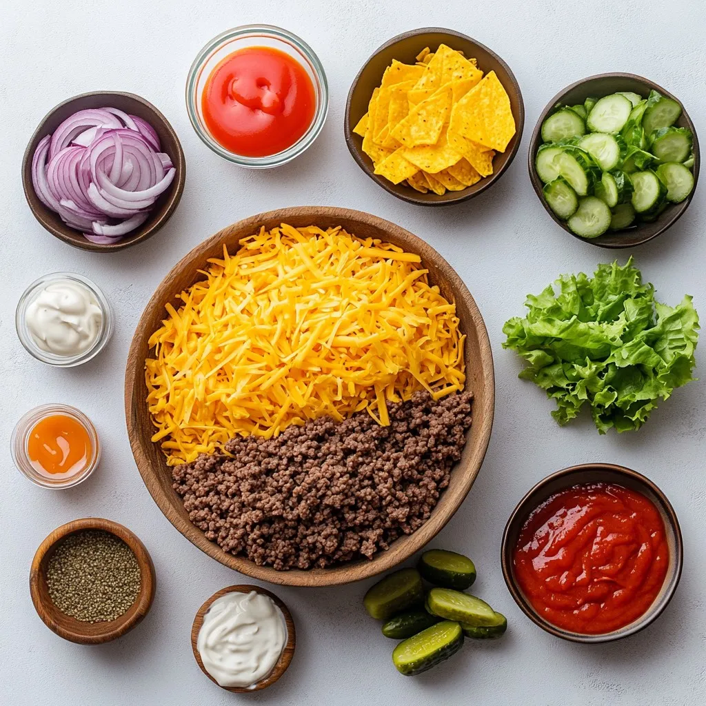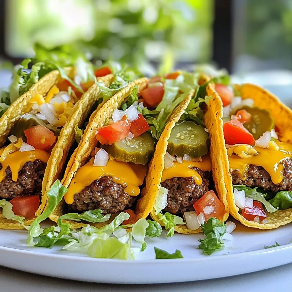 - 1 lb ground beef (80/20 blend for optimal juiciness) - 8 small corn tortillas - 1 cup shredded cheddar cheese - 1/2 cup lettuce, finely shredded - 1 large tomato, diced - 1/4 cup pickles, thinly sliced - 1/4 cup onion, finely chopped - 2 tablespoons mayonnaise - 2 tablespoons ketchup - 1 tablespoon mustard - Salt and pepper to taste - Cooking oil (for frying) You can enhance your tacos with extra toppings. Try avocado slices for creaminess. Jalapeños can add a spicy kick. Fresh cilantro brings a burst of flavor. Sour cream adds a cool and tangy touch. You can also use your favorite hot sauce for extra heat. The choices are endless, so mix and match! To make smash burger tacos, you need a few key tools: - A large skillet or griddle for cooking the beef. - A spatula to smash and flip the patties. - A mixing bowl for the sauce. - Another skillet or griddle to warm the tortillas. - A sharp knife and cutting board for prepping veggies. These tools will help you create delicious tacos quickly and easily. {{ingredient_image_2}} Start by getting your toppings ready. Shred the lettuce. Place it in a bowl to keep it fresh. Next, dice the tomato into small pieces. Set it aside until you need it. Slice the pickles thinly and chop the onion finely. Keeping these items organized helps when you assemble the tacos. To make the special sauce, grab a small mixing bowl. Combine the mayonnaise, ketchup, and mustard in the bowl. Mix well until the sauce is smooth. This sauce adds a tasty twist to your tacos. Set it aside for later use. Heat a large skillet or griddle over high heat. Add a little cooking oil to prevent sticking. Take about four ounces of the ground beef and shape it into a loose ball. Place this ball on the hot skillet. Use a spatula to press down firmly. Flatten the burger to about half an inch thick. Season it with salt and pepper. Let it cook for 2-3 minutes until a golden crust forms. Once the beef patty is cooked, flip it carefully using the spatula. Cook for another 1-2 minutes. Right after flipping, sprinkle a good amount of shredded cheddar cheese on top. Cover the skillet for about a minute, letting the cheese melt. While the patties cook, warm the corn tortillas in another skillet. Heat them for about 30 seconds on each side. They should be soft and slightly toasted. Now, to assemble your tacos, place each cooked patty on a warm tortilla. Top it off with shredded lettuce, diced tomato, chopped onion, and sliced pickles. Drizzle your homemade sauce over the top. Fold each tortilla over the filling, creating a taco shape. Enjoy them warm for the best taste! For smash burger tacos, I recommend using an 80/20 ground beef blend. This mix gives you the right fat content for juicy burgers. The fat makes the meat flavorful and tender. If you go leaner, your burgers might be dry. A good blend ensures your tacos stay moist and tasty. To get that perfect crust, heat your skillet on high. This step is key. Once the pan is hot, add a little cooking oil. Then, shape your beef into a loose ball. When you place it on the skillet, press down firmly. This creates a nice, golden crust. Let it cook without moving it for a few minutes. The crust forms best when you leave it alone. You can save time by prepping your ingredients in advance. Chop the vegetables a day before. Store them in the fridge to keep them fresh. You can also make the sauce ahead of time. Mix the mayonnaise, ketchup, and mustard, then store it in a jar. This way, when you’re ready to cook, everything is ready to go. Enjoy quick meals even on busy days! Pro Tips Choose the Right Beef: For the juiciest smash burgers, opt for an 80/20 blend of ground beef. This fat content ensures your burgers are flavorful and moist. Keep It Hot: Make sure your skillet or griddle is hot before adding the beef. This helps in creating that perfect sear and crispy crust that defines a great smash burger. Don’t Overcrowd: Cook the patties in batches if necessary. Overcrowding the skillet can lower the temperature and result in steaming rather than searing. Customize Your Toppings: Feel free to experiment with different toppings! Avocado, jalapeños, or even a spicy aioli can elevate your smash burger tacos to new heights. {{image_4}} To make spicy smash burger tacos, add heat with jalapeños. You can chop fresh jalapeños or use pickled ones. Mix in some hot sauce with your special sauce for extra zing. A sprinkle of cayenne pepper on the beef gives a nice kick too. Adjust the spice level to suit your taste. For a vegetarian twist, swap the beef for a plant-based option. Use black beans or lentils as your base. You can also try a veggie burger made from chickpeas or quinoa. For more flavor, add spices like cumin or smoked paprika. Top with your favorite fresh veggies, and you’ll have a tasty meal. Create a unique sauce by mixing ingredients. Try adding chipotle mayo for a smoky taste. A ranch dressing can give a creamy touch. You can also mix in some barbecue sauce for a sweet, tangy flavor. Don’t shy away from experimenting with flavors to find your perfect match! To store leftover tacos, wrap them in foil or plastic wrap. Place them in an airtight container. This keeps them fresh and prevents drying out. You can store them in the fridge for up to three days. You can freeze these tacos for later. First, let them cool completely. Wrap each taco tightly in plastic wrap. Then, place them in a freezer-safe bag or container. They will stay good for up to two months. To reheat frozen tacos, take them out and let them thaw in the fridge overnight. For quick reheating, use a microwave for about one minute. You can also heat them in a skillet on medium heat. This brings back their crispy texture. Enjoy your tasty tacos warm! The best meat for these tacos is ground beef with an 80/20 blend. This mix gives you a juicy burger. The fat adds flavor and moisture. You can also use ground turkey or plant-based meat if you prefer. Yes, you can use flour tortilla