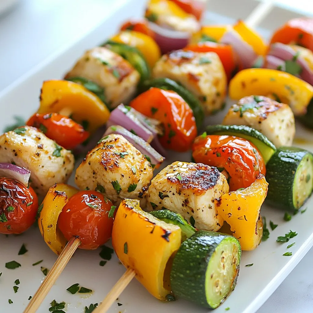 Delicious chicken kabobs roasted with colorful vegetables, perfect for a quick and flavorful meal.
