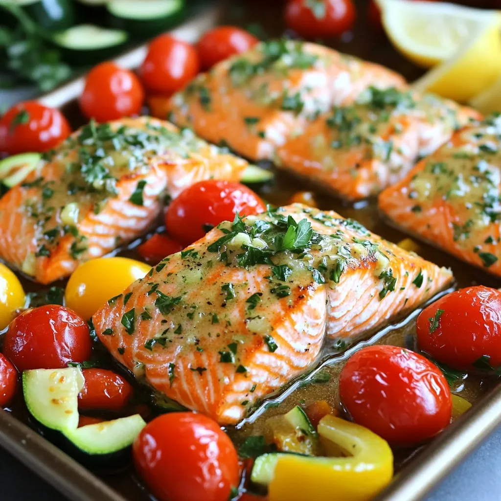 For a rustic feel, serve the dish straight from the sheet pan. If you want a fancier look, plate each salmon fillet with a mix of colorful veggies. Garnish with fresh parsley and lemon wedges for a pop of color. Pair this meal with a light white wine like Sauvignon Blanc. It complements the flavors of the salmon beautifully. You can also serve it with a simple side salad or crusty bread for a complete meal.