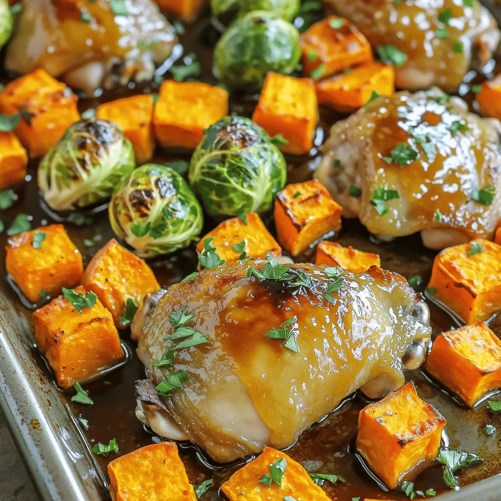 - 4 bone-in chicken thighs, skin-on - 2 large sweet potatoes, peeled and cut into 1-inch cubes - 2 tablespoons olive oil - 1/4 cup pure maple syrup - 2 tablespoons Dijon mustard - 1 teaspoon garlic powder - 1 teaspoon smoked paprika - Salt and pepper to taste - 1/2 teaspoon ground cinnamon - 1 cup Brussels sprouts, halved (optional for extra veggies) - Fresh parsley, chopped for presentation For this dish, I love using chicken thighs. They stay juicy and have great flavor. Sweet potatoes add sweetness and texture. Olive oil makes everything crispy while maple syrup brings a lovely glaze. Dijon mustard gives it a hint of tang. The spices really pull this dish together. Garlic powder and smoked paprika boost the flavor. Salt and pepper are key for seasoning. Ground cinnamon adds warmth. If you want more veggies, Brussels sprouts work great. Finally, a sprinkle of fresh parsley brightens up the plate. It makes the dish look pretty and fresh. This simple list of ingredients helps create a meal that is easy and delicious. First, preheat your oven to 425°F (220°C). This high heat helps the chicken and sweet potatoes cook evenly. While the oven heats, grab a small bowl. In that bowl, whisk together 1/4 cup of pure maple syrup, 2 tablespoons of Dijon mustard, 1 teaspoon of garlic powder, 1 teaspoon of smoked paprika, 1/2 teaspoon of ground cinnamon, salt, and pepper. This mix will be our tasty marinade. Next, take a large mixing bowl and add 2 large sweet potatoes, peeled and cut into 1-inch cubes. If you want extra veggies, add 1 cup of halved Brussels sprouts. Pour half of the maple marinade over the sweet potatoes and Brussels sprouts. Drizzle 1 tablespoon of olive oil on top. Now, toss everything well until the veggies are nicely coated. Now it’s time to arrange the food on the sheet pan. Place the chicken thighs on one side of the pan. Drizzle the remaining olive oil over the chicken. Season the chicken with salt, pepper, and a sprinkle of garlic powder. Then, add the sweet potato mixture to the other side of the pan, spreading it out evenly. Finally, brush the remaining maple marinade generously over the chicken thighs. Slide the sheet pan into your preheated oven. Bake for about 35-40 minutes. You want the chicken to reach an internal temperature of 165°F (75°C). During baking, the sweet potatoes should become tender and caramelized. For crispy skin, turn on the broiler for an extra 2-3 minutes at the end. Keep a close eye to avoid burning. Once done, remove the pan and let it rest for 5 minutes. For the best results, timing is key. Bake the chicken and sweet potatoes for 35-40 minutes. This timing works well for the chicken thighs. You want an internal temperature of 165°F (75°C). Use a meat thermometer to check. Insert it into the thickest part of the thigh, avoiding the bone. To boost flavor, try adding spices like cayenne or thyme. They add depth and warmth. You can also drizzle extra maple syrup right before serving. This will enhance the sweetness and give a lovely glaze. For a rustic touch, serve directly from the sheet pan. This makes for an inviting presentation. If you prefer, use a serving platter. Arrange the chicken and sweet potatoes artfully. Sprinkle fresh parsley on top for a pop of color. {{image_2}} You can switch up the veggies in this dish. Carrots, green beans, or even broccoli work well. If you add these, adjust the cooking time. For carrots, cut them into small pieces. They may need 5 more minutes to cook. Green beans take less time, around 25 minutes. Always check for doneness. Chicken thighs shine in this recipe, but you can use chicken breasts or drumsticks too. For chicken breasts, cut the cooking time to about 30-35 minutes. Drumsticks will take about the same time as thighs. If you're looking for a vegetarian option, try chickpeas or tofu. Marinate them just like the chicken for great flavor. Want a fresh twist? Add herbs like rosemary or thyme for brightness. Citrus, like lemon or orange zest, adds a nice zing too. You can also experiment with different mustards. Spicy brown mustard gives a good kick, while honey mustard adds sweetness. Mix and match to find your favorite flavor profile! To store leftovers, let the dish cool first. Place the chicken and sweet potatoes in an airtight container. This helps keep out air and moisture. You can store it in the fridge for about 3 to 4 days. When you want to reheat, use your oven for the best results. Preheat your oven to 350°F (175°C). Heat the meal for about 20 minutes or until hot. You can also use a microwave, but the oven keeps the chicken crisp. If you want to freeze this dish, let it cool completely. Place the chicken and sweet potatoes in a freezer-safe bag or container. This way, you can enjoy it later. It will stay fresh for up to 3 months in the freezer. When you are ready to eat, defrost it in the fridge overnight. For cooking, bake it at 375°F (190°C) for about 40-50 minutes. Check that the chicken reaches 165°F (75°C) inside. For the best taste, eat the dish within 3 to 4 days if refrigerated. In the freezer, it can last for about 3 months. Signs of spoilage include a strange smell, changes in color, or a slimy texture. If you see any of these, it's best to throw it away. Always trust your senses when checking food! You can swap chicken thighs for several options. Here are a few ideas: - Chicken breasts: They are leaner and cook faster. - Chicken drumsticks: They add a nice flavor and stay juicy. - Turkey thighs: A great alternative for a richer taste. - Tofu: For a vegetarian option, use firm tofu. Just press and cube it. - Tempeh: This gives a nice texture and absorbs flavors well. Each option may change cooking times, so keep an eye on them! Yes, you can prepare this dish before the meal. Here are some tips: - Marinate the chicken: Let it sit in the maple mix for at least 30 minutes. - Chop sweet potatoes: You can cut them a day ahead. Store them in water to keep fresh. - Combine veggi