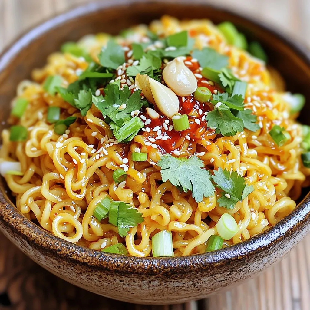 Finally, stir in the sliced green onions and sesame seeds. Season with salt and pepper to taste. For a fresh finish, garnish with cilantro. Serve your spicy garlic chili crisp noodles hot and enjoy the burst of flavors!