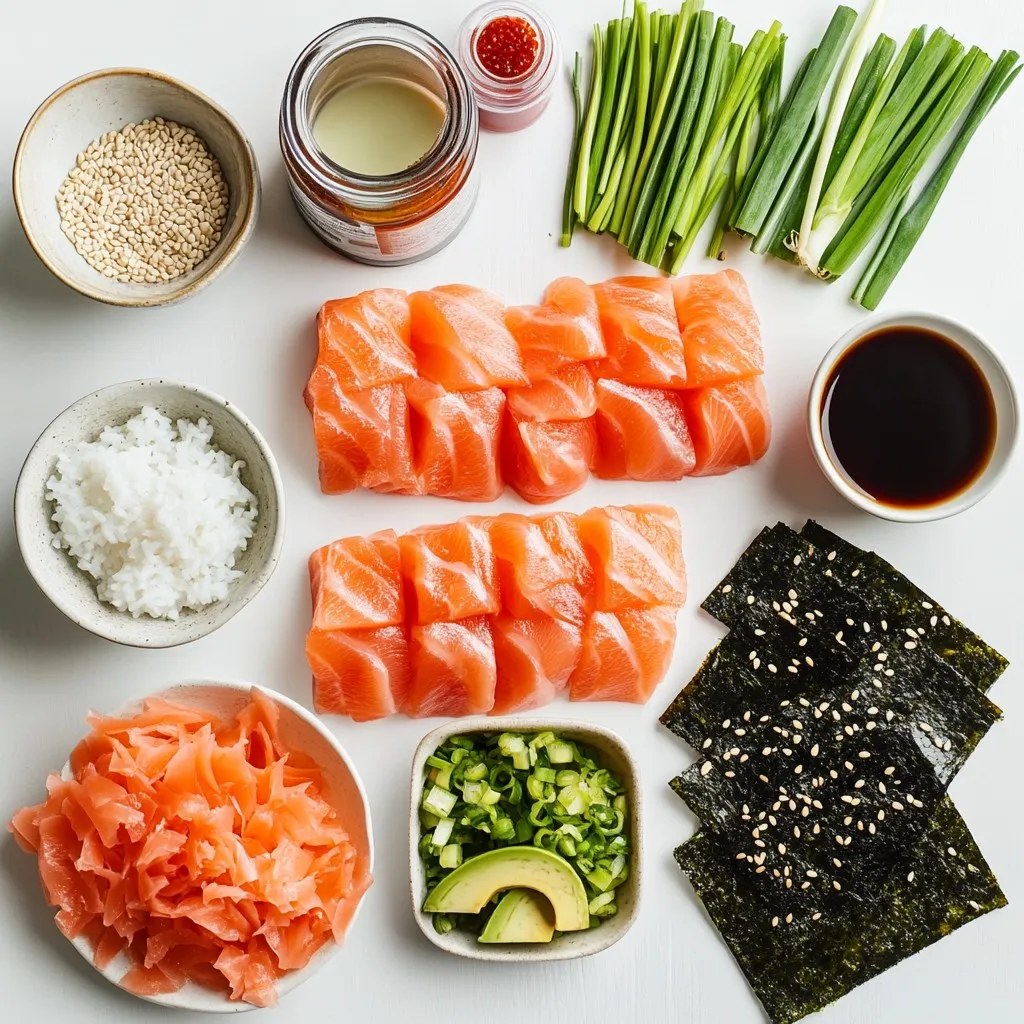 To make this spicy salmon sushi bake, you need a few key ingredients. Sushi rice is the base. It gives the dish its signature texture. The fresh salmon brings rich flavor. You can use diced salmon for easy mixing. The seasonings, like mayonnaise and Sriracha, add creaminess and heat.