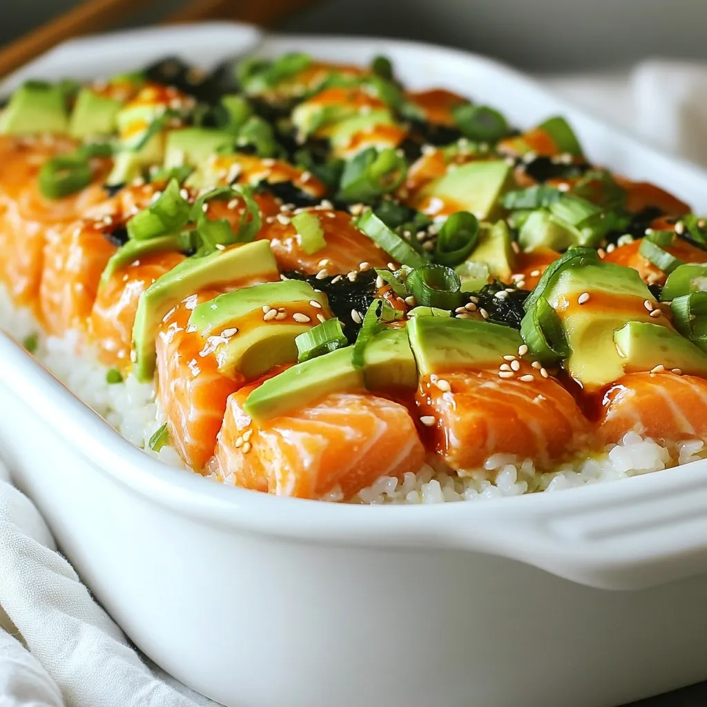 A delicious and easy-to-make sushi bake featuring spicy salmon and sushi rice, topped with fresh ingredients.