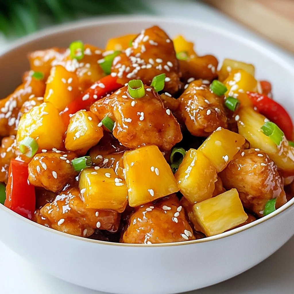 A delicious and vibrant dish featuring crispy chicken pieces coated in a tangy sweet and sour sauce, complemented by bell peppers and pineapple.