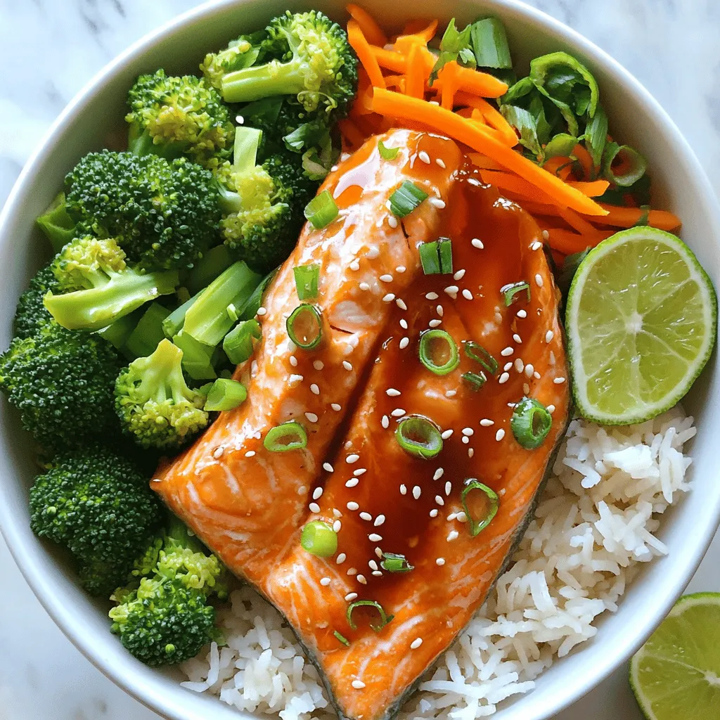 Gathering these ingredients makes cooking quick and fun. Start with fresh salmon fillets. They should weigh around 6 ounces each. This size cooks well in a short time. Next, get your jasmine rice ready. It gives a nice, fluffy base for the bowl. Use cooked rice to save time.