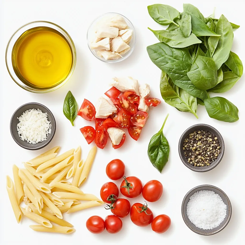A creamy and flavorful pasta dish featuring tender chicken, fresh spinach, and cherry tomatoes.