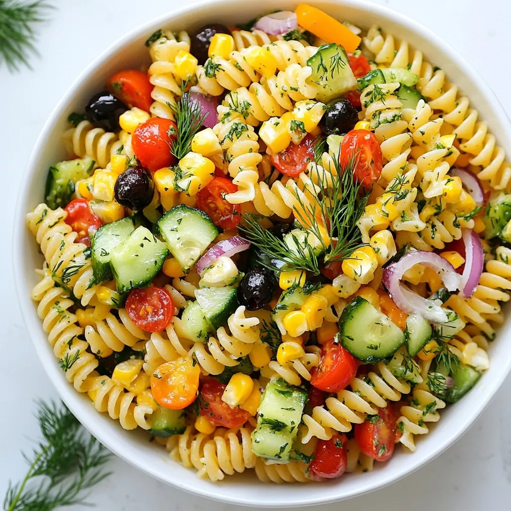 • While the pasta cools, prepare the vegetables. In a spacious mixing bowl, combine the diced cucumber, halved cherry tomatoes, diced bell pepper, finely chopped red onion, corn, sliced black olives, and freshly chopped dill. Toss gently to mix.