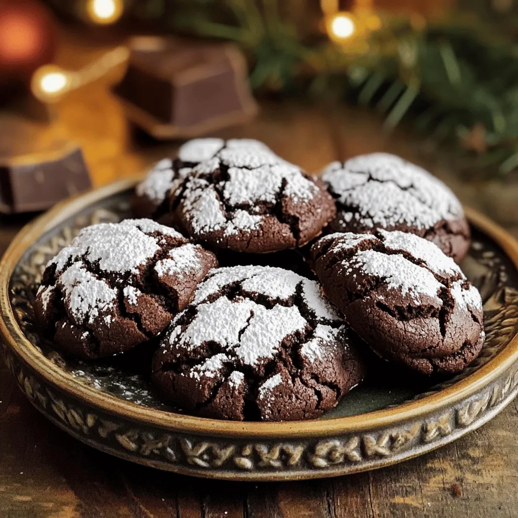 - 1 cup all-purpose flour - 1/2 cup cocoa powder - 1/2 teaspoon baking powder - 1/4 teaspoon salt - 1/2 cup granulated sugar - 1/2 cup brown sugar, packed - 1/4 cup vegetable oil - 2 large eggs - 1 teaspoon vanilla extract - 1/2 cup powdered sugar, for coating For a gluten-free option, you can use almond flour or coconut flour. These flours give cookies a nice texture. If you choose almond flour, you may need to adjust the liquid. For cocoa powder, you can use Dutch-processed cocoa for a richer taste. Dark cocoa powder also adds a deeper chocolate flavor. To get the best results, measure your ingredients carefully. Use a dry measuring cup for flour and cocoa powder. Spoon the flour into the cup, then level it off with a knife. This method avoids packing the flour down too much. For sugar, scoop it directly into the cup, then level it off. Accurate measurements help make your cookies soft and chewy, which is what we want! First, preheat your oven to 350°F (175°C). This step is important for even baking. Next, line a baking sheet with parchment paper. This keeps the cookies from sticking. Now, sift together the flour, cocoa powder, baking powder, and salt in a medium bowl. Sifting helps mix the dry ingredients well and adds air for a lighter cookie. In a large mixing bowl, whisk together the granulated sugar, brown sugar, and vegetable oil until smooth. This mixture should feel creamy. Add the eggs one at a time, whisking well after each. This keeps the eggs from clumping. Stir in the vanilla extract for flavor. Gradually mix in the dry ingredients. Stop mixing once the dough is combined. You want it to be thick and sticky. Cover the dough with plastic wrap and refrigerate for about 30 minutes. This makes the dough easier to handle. After chilling, scoop out tablespoon-sized portions and roll them into balls. Roll each ball in powdered sugar until well-coated. Place the cookies on the prepared baking sheet, leaving about 2 inches between them. Bake in the preheated oven for 10-12 minutes. The edges should look set, and the tops should be crinkled. Let the cookies cool on the baking sheet for 5 minutes before moving them to a wire rack. Enjoy your warm chocolate crinkle cookies! To make thick and chewy cookies, here are some key tips: - Chill the dough: Refrigerate the dough for about 30 minutes. This helps the cookies hold their shape. - Use the right flour: Stick to all-purpose flour for the best texture. - Don’t over-mix: Mix just until combined to avoid tough cookies. Common mistakes to avoid include: - Skipping the chilling step: This can lead to flat cookies. - Not measuring accurately: Use proper measuring cups for flour and cocoa to avoid dry dough. Adding chocolate chips or nuts can boost the flavor: - Chocolate chips: Fold in half a cup of chocolate chips for extra richness. - Nuts: Chopped walnuts or pecans add a nice crunch. You can also explore flavor variations: - Extracts: Try almond or mint extract for a unique twist. - Spices: A pinch of cinnamon can add warmth and depth. Using the right tools makes a big difference. Here are my top picks: - Mixing bowls: Have both large and medium-sized bowls for mixing ingredients. - Measuring cups: Use dry measuring cups for ingredients like flour and sugar. Parchment paper is key for baking: - Non-stick surface: It prevents cookies from sticking to the pan. - Easy cleanup: Just lift the parchment and toss it away. These tips help you create warm, delicious chocolate crinkle cookies every time! {{image_2}} You can be creative with crinkle cookies. Mint chocolate crinkle cookies are a fun twist. Just add a few drops of mint extract to the dough. This gives your cookies a refreshing taste. Peanut butter chocolate crinkle cookies are also a treat. Replace some of the vegetable oil with creamy peanut butter. This adds a rich flavor that pairs well with chocolate. If you follow a vegan diet, you can still enjoy these cookies. Use flax eggs instead of real eggs. Mix one tablespoon of ground flaxseed with three tablespoons of water. Let it sit until it thickens. This works great in cookie recipes. For low-sugar options, use sugar substitutes. Try using stevia or monk fruit sweetener. Adjust the amounts based on the product instructions. This way, you can still enjoy the sweetness without the calories. You can make holiday-themed crinkle cookies too. Add spices like cinnamon or nutmeg for a festive flair. You can also shape the cookies into fun holiday forms. Incorporating seasonal flavors keeps things interesting. For fall, mix in pumpkin spice. In spring, use fresh lemon zest for a bright flavor. These twists make each batch unique and exciting! To keep your warm chocolate crinkle cookies fresh, use an airtight container. This helps lock in moisture and flavor. If you don’t have one, a cookie jar can work, but it may not keep them as fresh. Make sure the cookies are cool before you store them. If they are warm, they can create steam, making them soggy. You can freeze cookie dough for later use. This is a great way to enjoy fresh cookies anytime. To freeze the dough, scoop it into balls and place them on a baking sheet. Freeze the balls for about an hour, then transfer them to an airtight container. When you're ready to bake, just take out the dough and let it thaw for about 30 minutes. Preheat your oven and bake as usual. These cookies last about five days at room temperature. After that, they may start to lose their taste and texture. Signs of spoilage include a dry or hard texture and any strange smells. If you see mold, it's best to throw them away. Enjoy these cookies fresh, or freeze them for a treat later! Crinkle cookies crack due to the powdered sugar and the baking process. When you roll the cookie balls in powdered sugar, it creates a lovely white coat. As the cookies bake, the dough expands and rises. The powdered sugar does not melt away. Instead, it stays on top. This causes the cracks to form as the cookie puffs up and pull